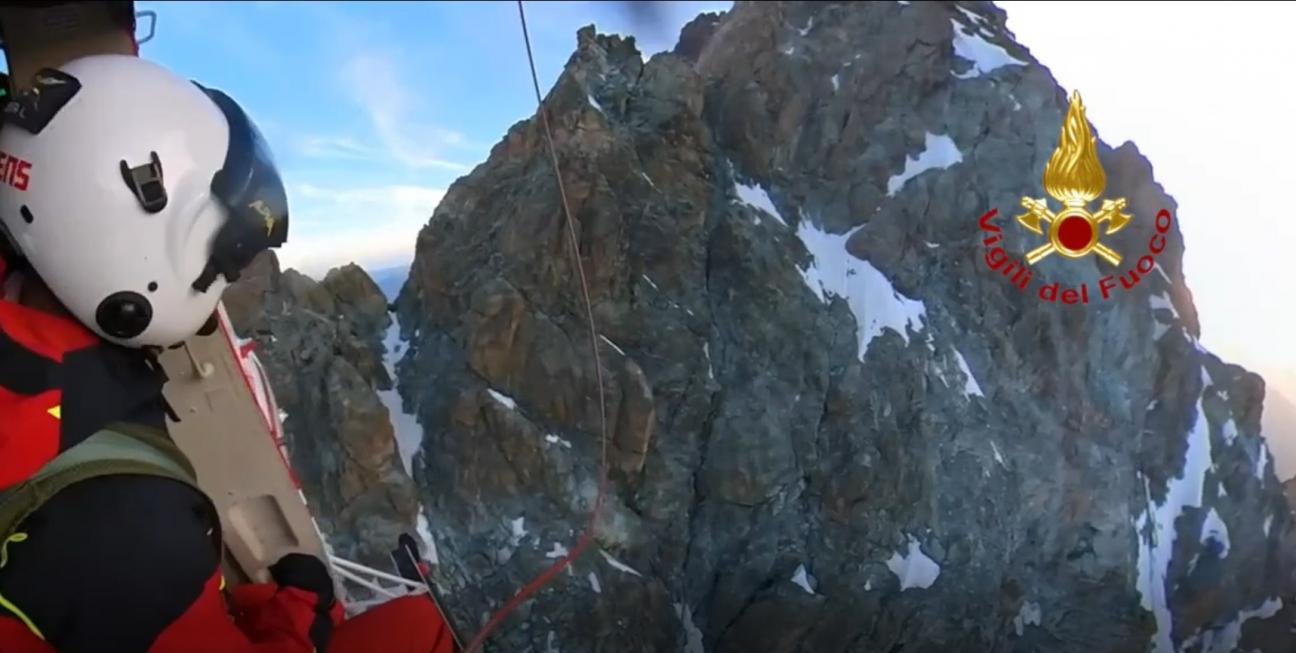Elicottero del reparto volo Piemonte dei Vigili del fuoco in azione alle ore 20 poco sotto la cima del Monviso sulla parete Est. Recuperati dagli elisoccorritori a 3.600 metri di quota, con una manovra al verricello, 5 alpinisti in difficoltà.