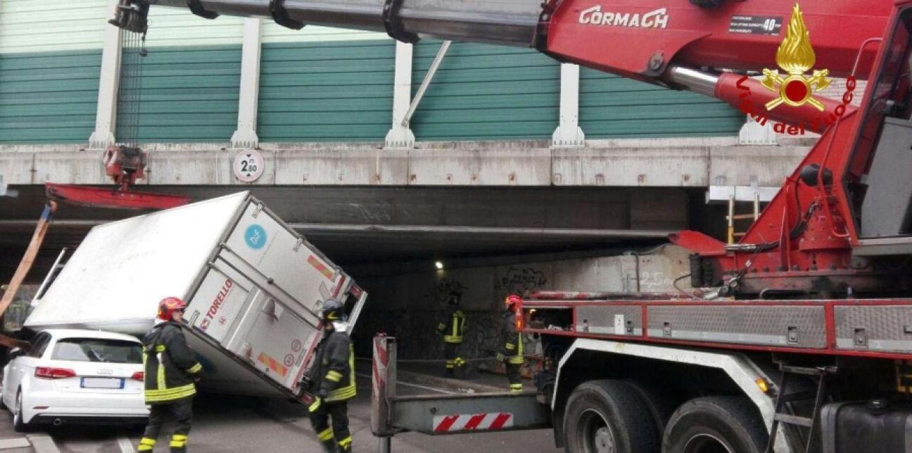Un autocarro centinato con cella frigorifera, all'altezza del cavalcavia della autostrada "A.1" è entrato in collisione con la struttura del ponte rimanendo incastrato, piegandosi su un lato e danneggiando